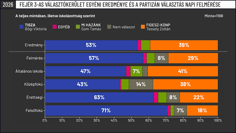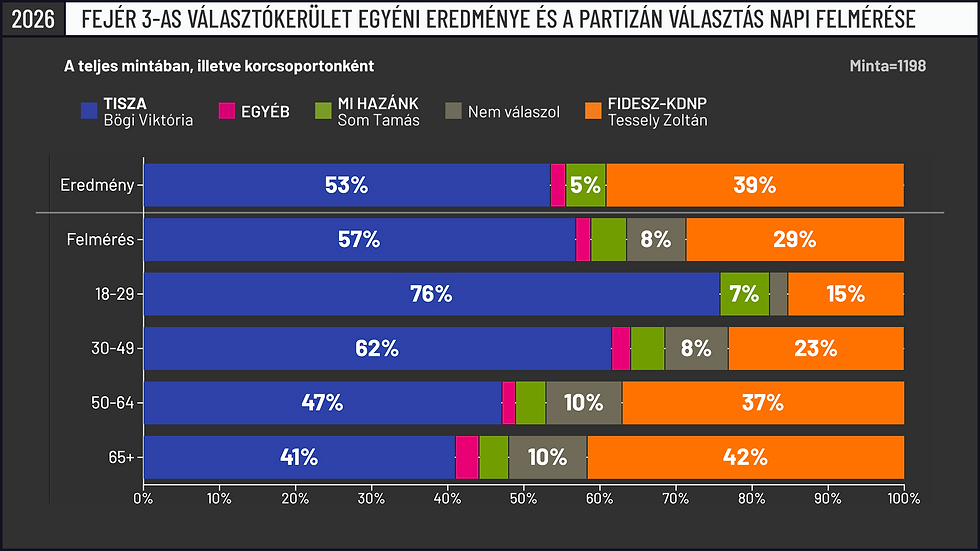 Ebben a Fejér megyei kerületben pedig ismét nagyobb választói szakadékot figyelhetünk meg a generációk között, mint az iskolai végzettség tekintetében, habár a legidősebbek körében itt abszolút versenyben volt Tisza is. A 30 évnél fiatalabbak között azonban a Fidesz bőven 20 százalék alatti támogatottságot szerzett.